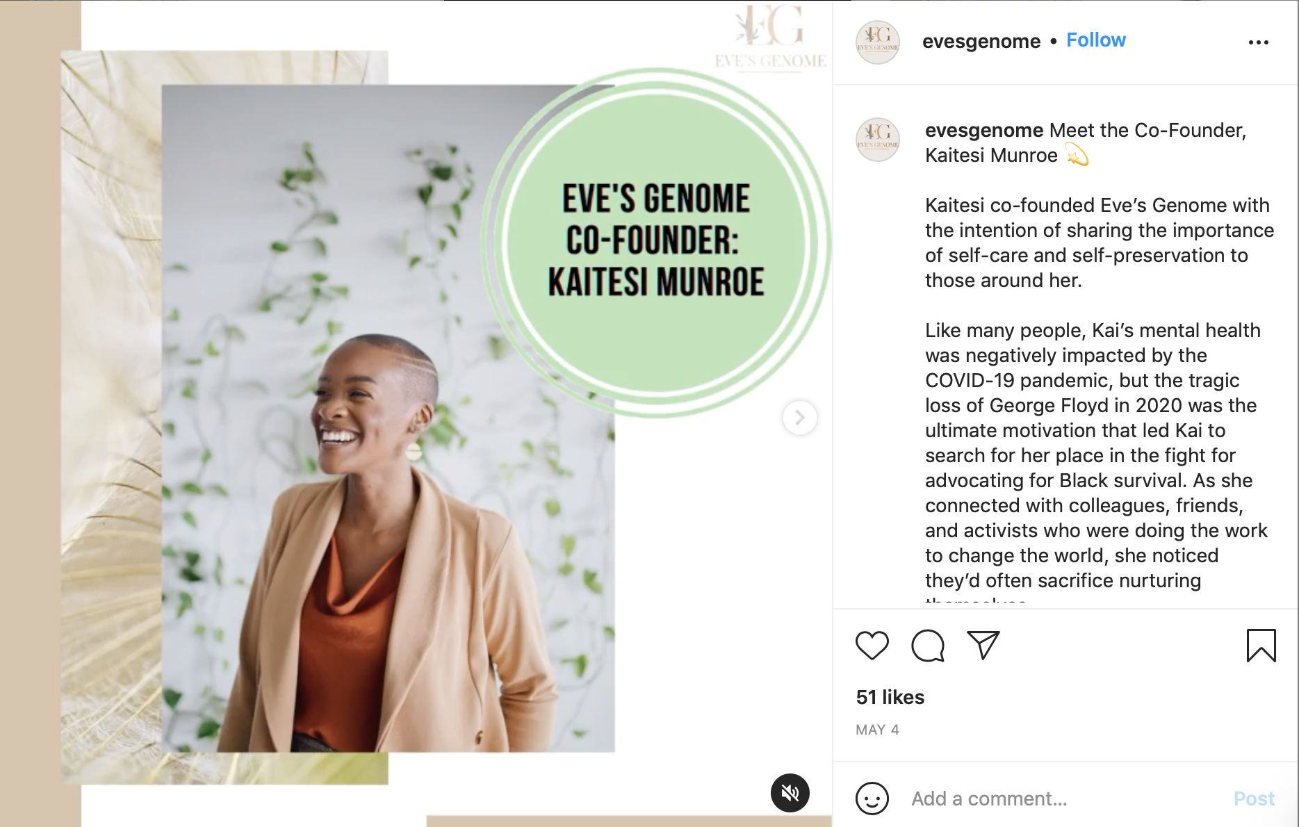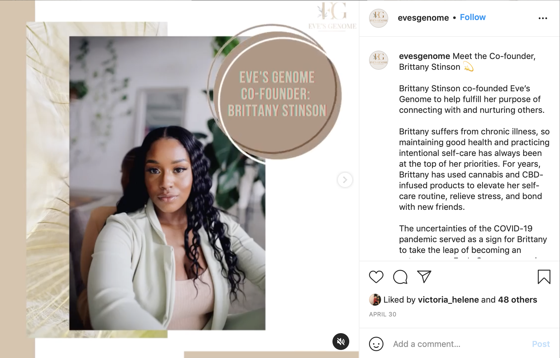 Kaitesi and Brittany, the founders of Eve’s Genome, were ready to stir up some excitement about their new CBD-infused wellness products. We worked together to develop a brand voice, which I used to write each of their founder bios and other branded content for their Instagram profile.